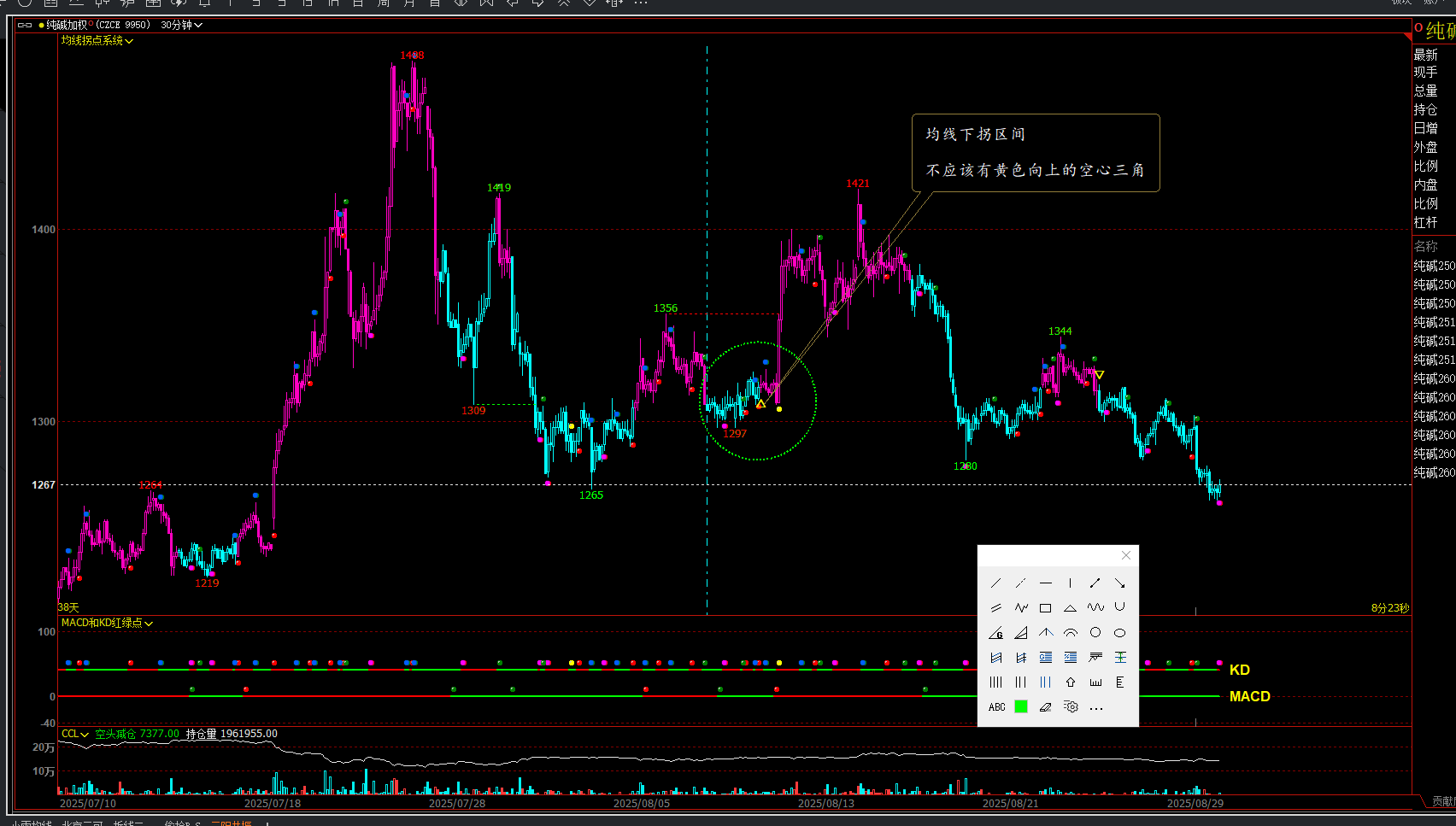 KK1:=均线下拐区间&&CROSS(青色区间,0.5)&&REF(粉色区间高点上升&&VALUEWHEN(青色区间,青色区间低点上升),1)&&COUNT(CROSS(青色区间,0.6),BARSLASTCOUNT(均线下拐区间))>=2; 补做空进场点:=均线下拐区间&&CROSS(青色区间,0.5)&&REF(粉色区间高点下降,1)&&COUNT(CROSS(青色区间,0.5)&&REF(粉色区间高点下降,1),BARSLAST(KK1)+1)=1; DRAWTEXT(补做空进场点,H,'',COLORYELLOW,FONTSIZE25,VALIGN2;// DD1:=均线上拐区间&&CROSS(粉色区间,0.5)&&REF(青色区间低点下降&&VALUEWHEN(粉色区间,粉色区间高点下降),1)&&COUNT(CROSS(粉色区间,0.6),BARSLASTCOUNT(均线上拐区间))>=2; 补做多进场点:=均线上拐区间&&CROSS(粉色区间,0.5)&&REF(青色区间低点上升,1)&&COUNT(CROSS(粉色区间,0.5)&&REF(青色区间低点上升,1),BARSLAST(DD1)+1)=1; DRAWTEXT(补做多进场点,L,'',COLORYELLOW,FONTSIZE25,VALIGN0;//
