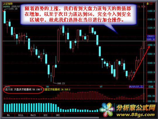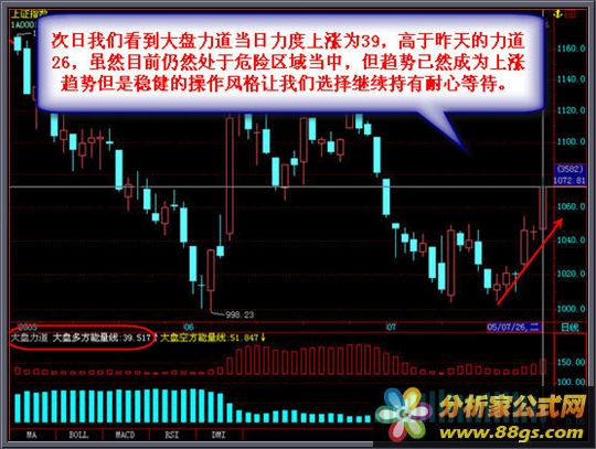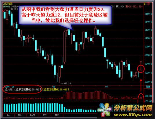 [大盘力道]是根据市场交易安全定位核心标准开发出的全新区域安全评测系统,可以有效的判断大盘和个股的安全度,安全区域分别为45上和45下 45上包含45的时候就代表大盘和个股目前处于安全区域,在安全区域中我们就可以大胆操作并可以适当重仓,那么如果力道显示45以下时代表了目前大盘或个股属于危险区域,在这样的情况下我们的操作方式可采取为空仓不操作或轻仓操作方式这样极大的保护了我们的资金安全,达到稳中求胜的效果了。当大盘和个股处于上升状态时,相对应的力道也是在逐渐的加大,大盘和个股的上涨过程往往都是由低到高的走势,但是没有发生之前我们并不能够判断大盘或这支股票是否要上涨,但是我们通过力道可以看出在危险区域中力道不断的加大,但始终处于危险区域时我们的操作方式是轻仓操作,而当力道不断提高达到45和45以上时就是我们加仓的最好时机,这样将一个波段完美的操作完毕了。